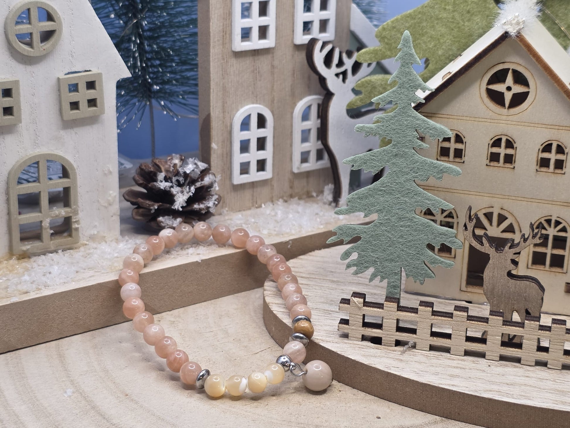 Bracciale realizzato con sfere 6mm Pietra del sole e Madreperla ed inserti in acciaio.