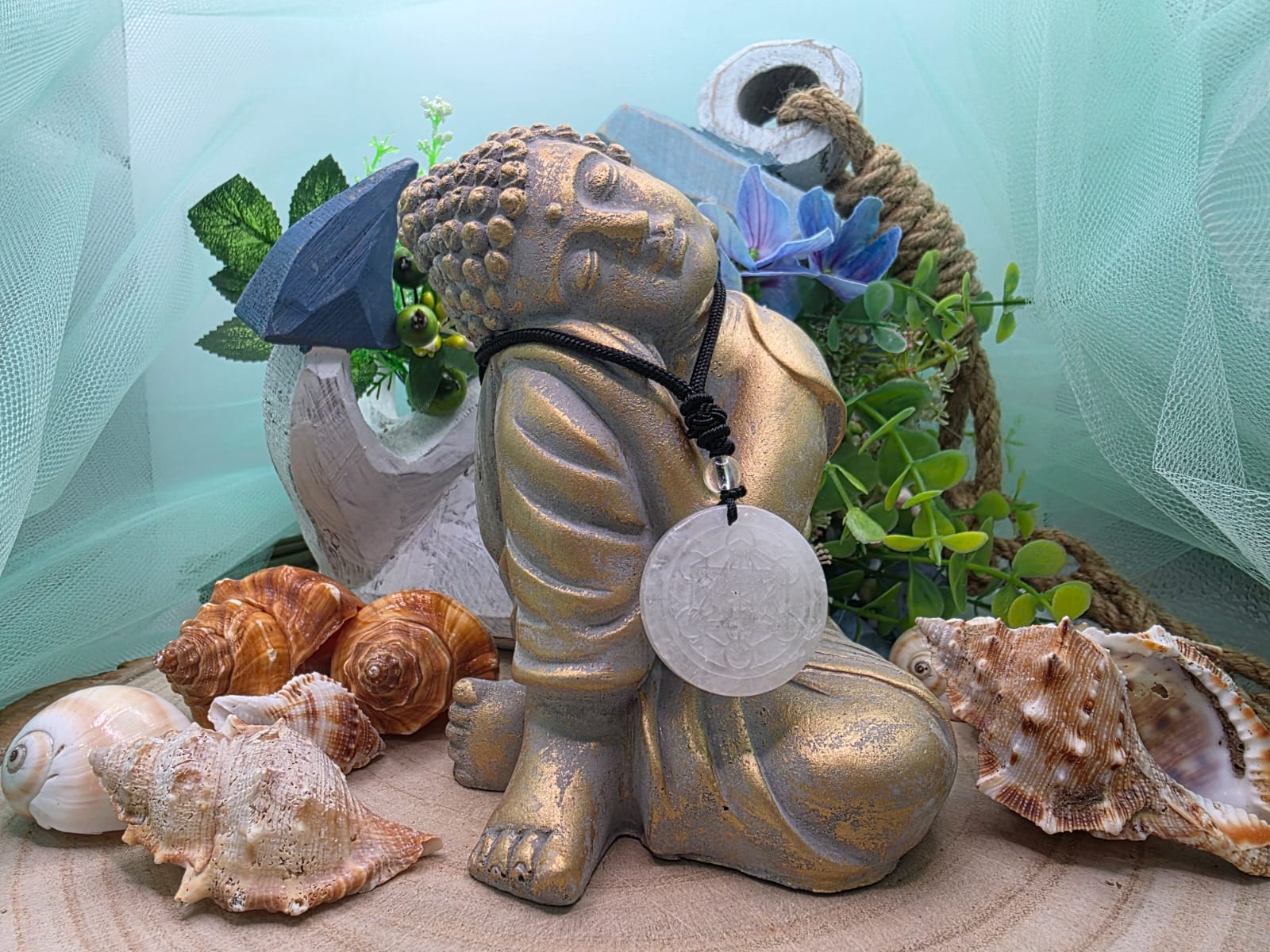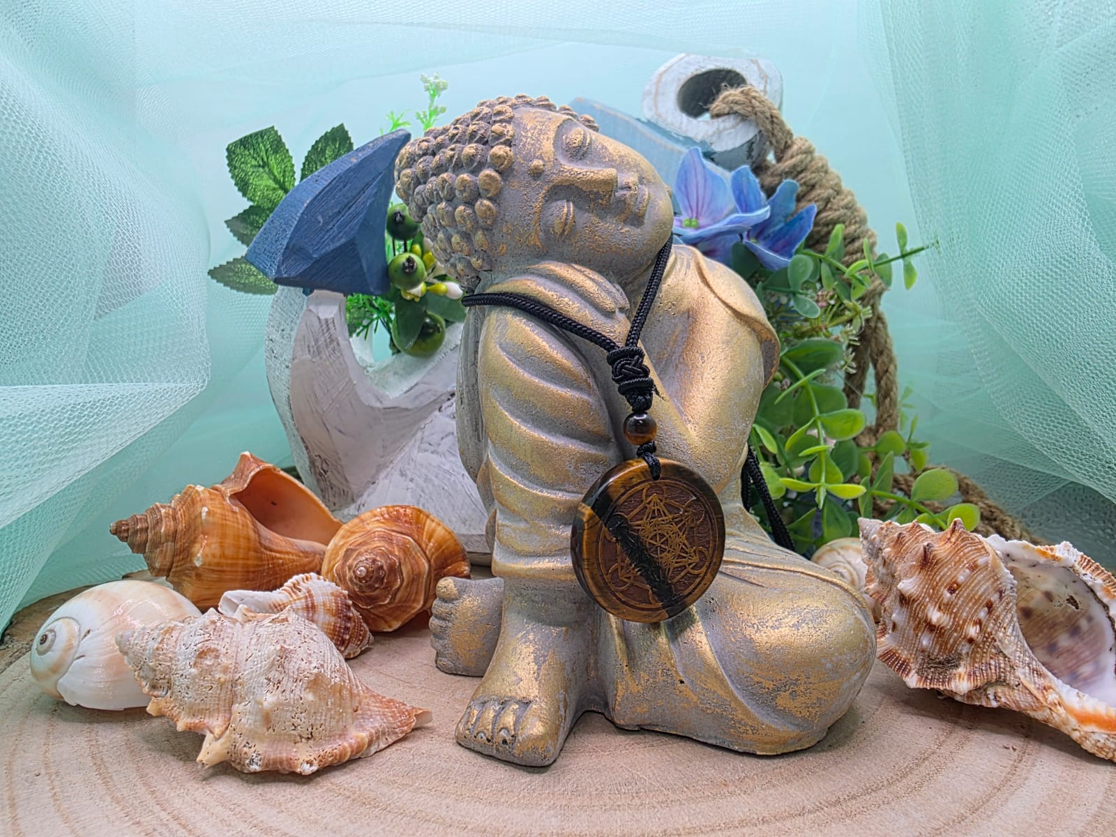 Ciondolo in pietra naturale con inciso il simbolo di Metatron con cordino in cotone.