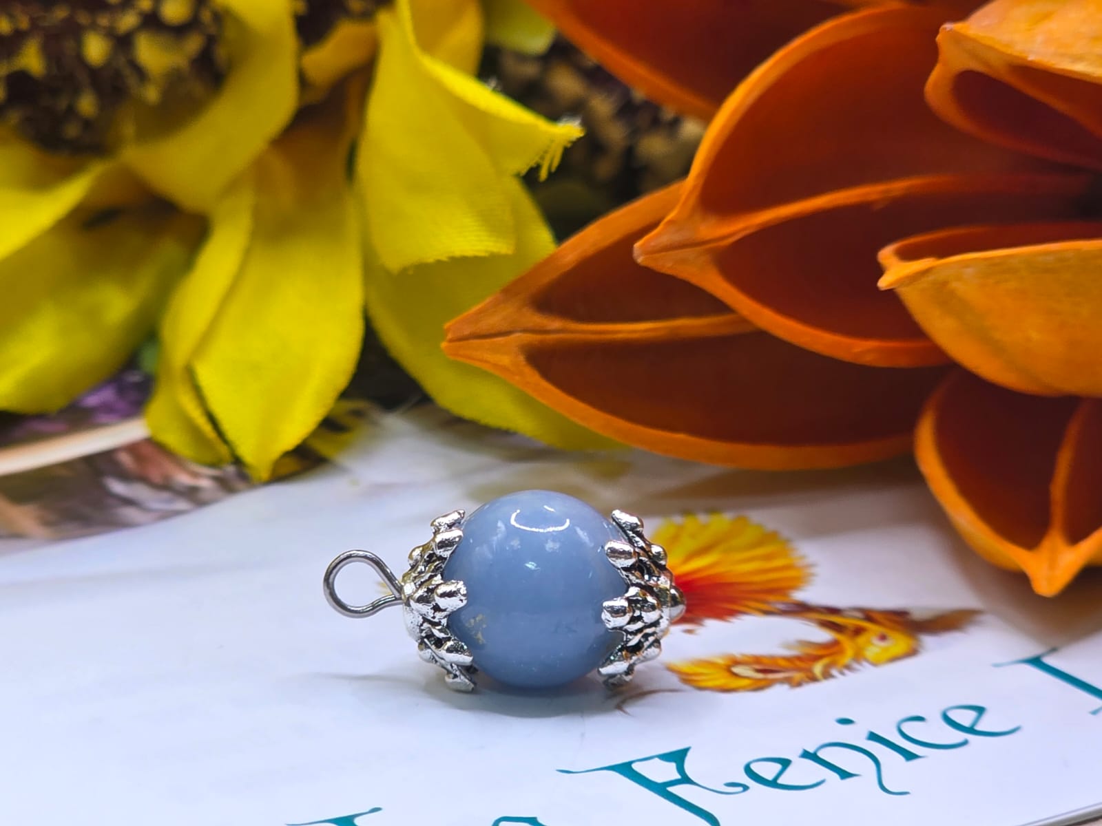 Ciondolo portafortuna 'Su Coccu' per augurare a chi lo riceve protezione e la possibilità di realizzare i propri desideri. Realizzato con pietre a sfera 10/12 mm. angelite completo di catena in acciaio.