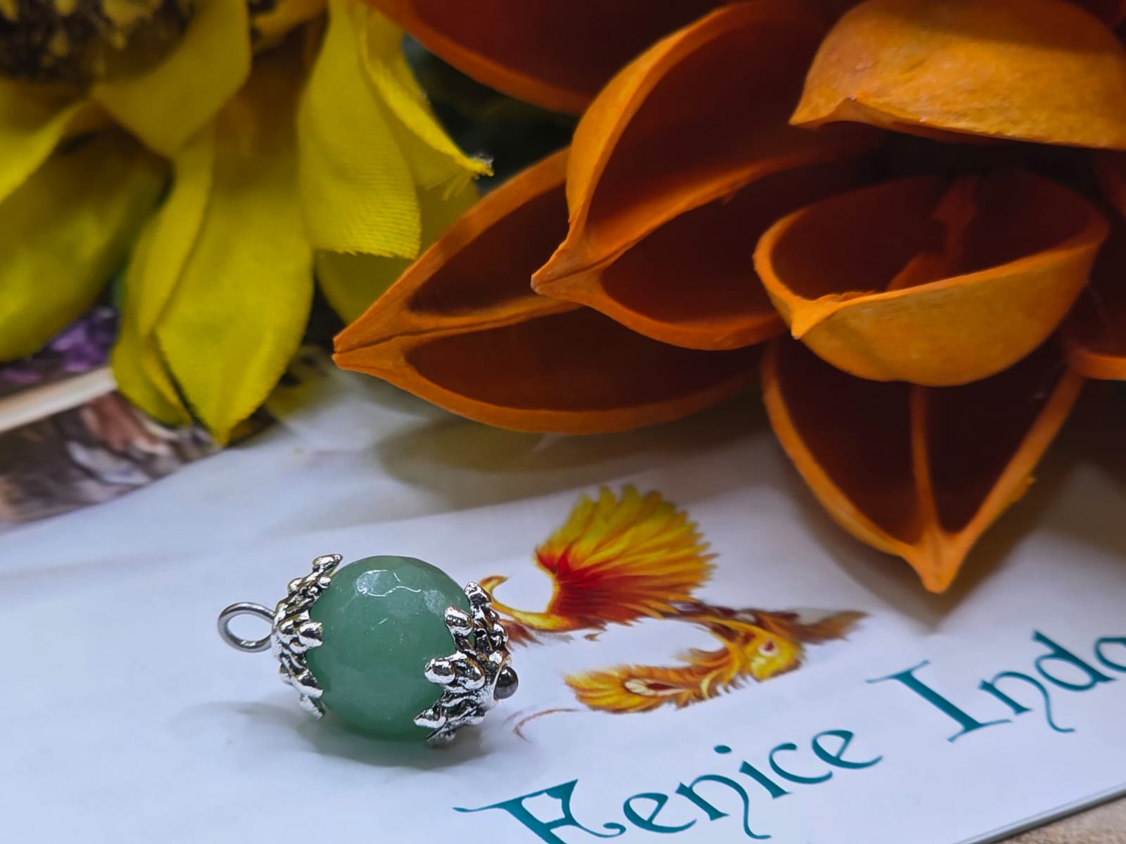 Ciondolo portafortuna 'Su Coccu' per augurare a chi lo riceve protezione e la possibilità di realizzare i propri desideri. Realizzato con pietre a sfera 10/12 mm. avventurina. completo di catena in acciaio.
