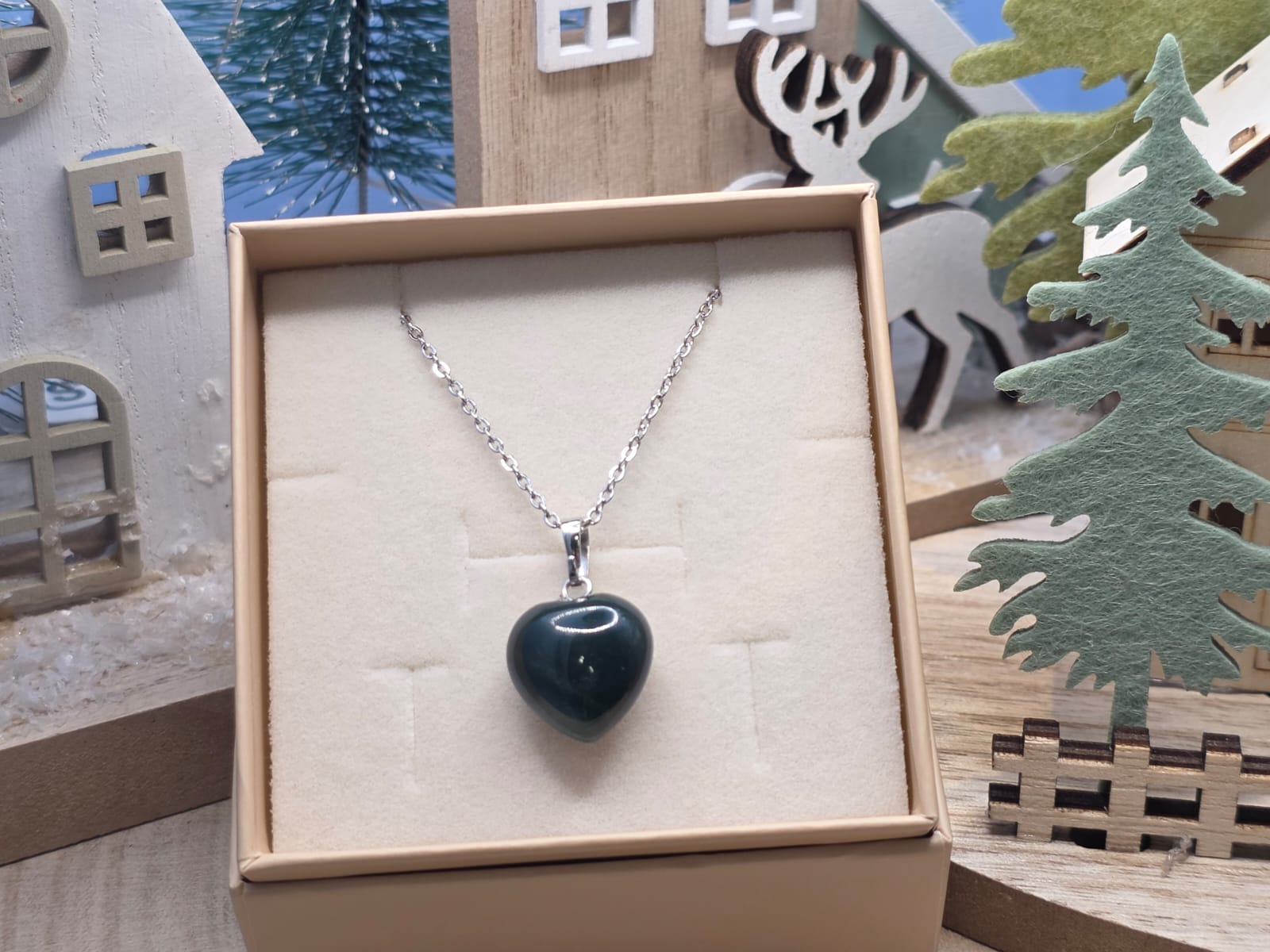 Ciondolo cuore di agata muschiata completo di catenina in acciaio.
