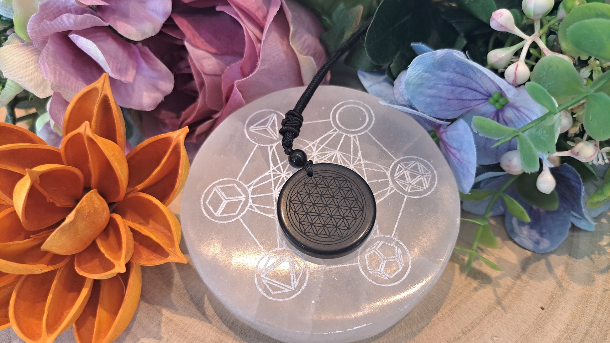 Ciondolo Fiore della Vita Ossidiana Nera