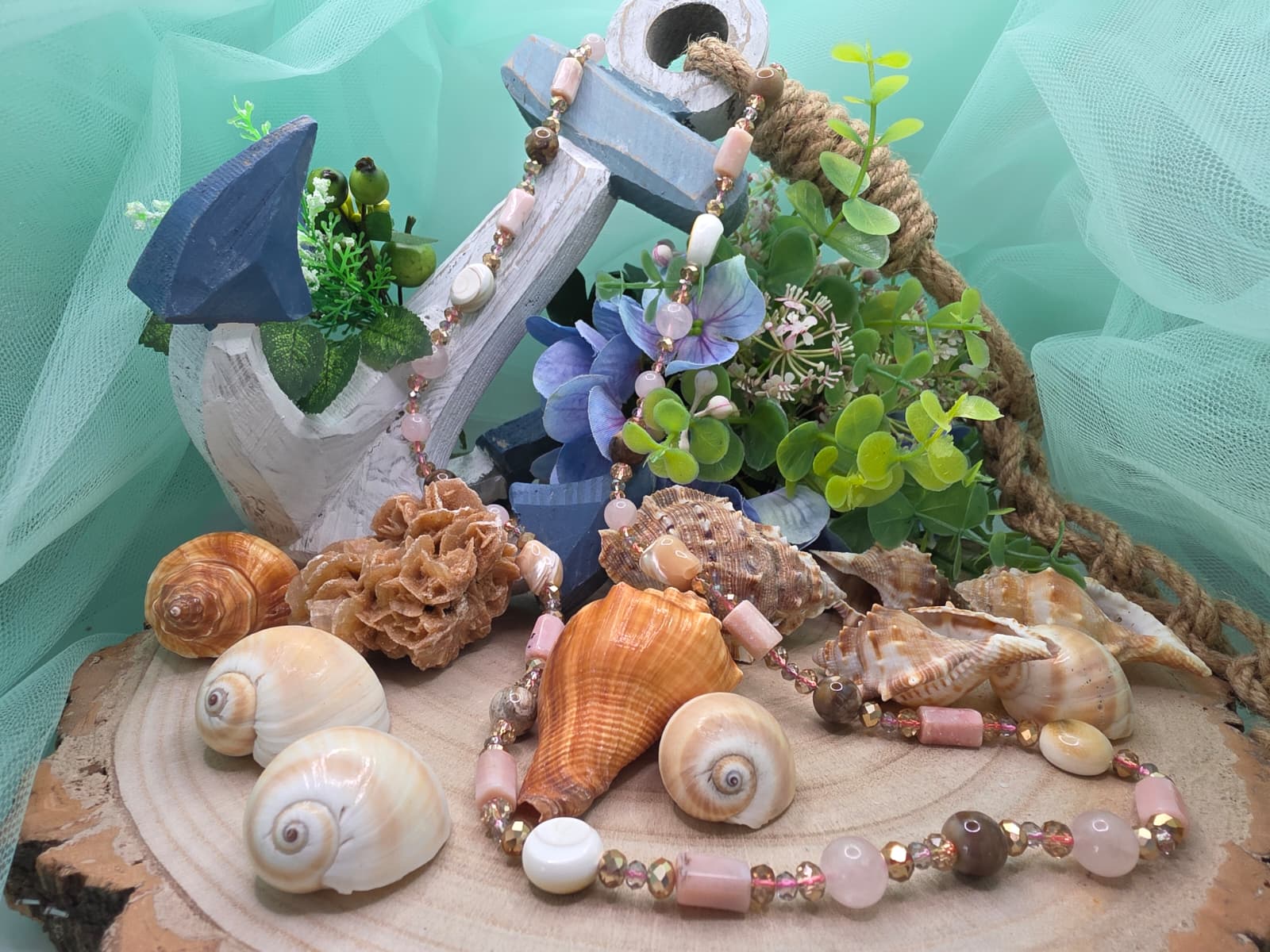 Collana realizzata con bacchette di Opale Rosa, Quarzo Rosa, Legno Fossile ed Occhio di Santa Lucia