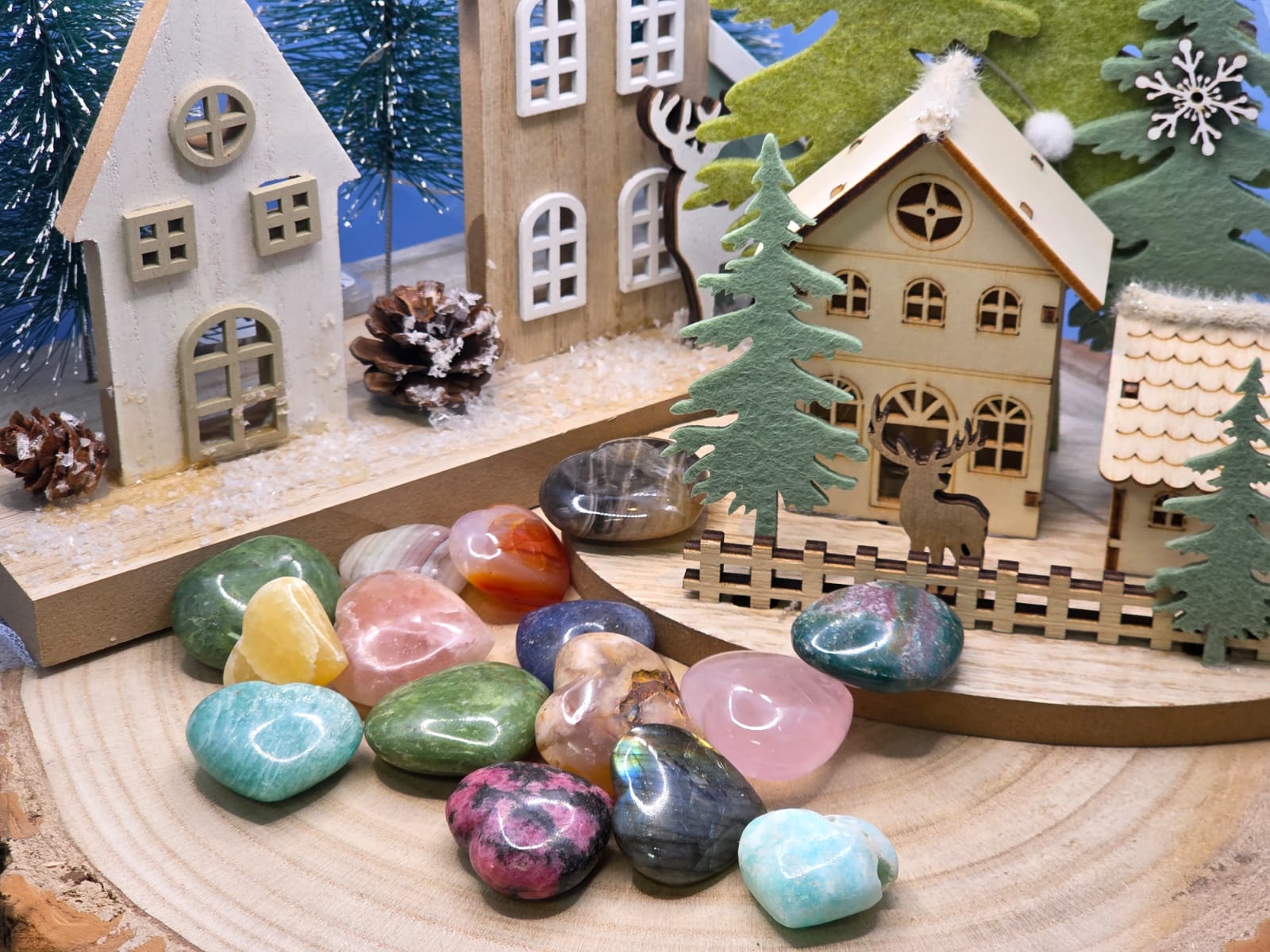 Cuori realizzati in Amazzonite, Labradorite, Corniola, Quarzo ialino, quarzo fumè, quarzo rosa, Rodonite, Diaspro oceano, Agata fiore, Grossularia, Calcite rosa, Calcite arancio.