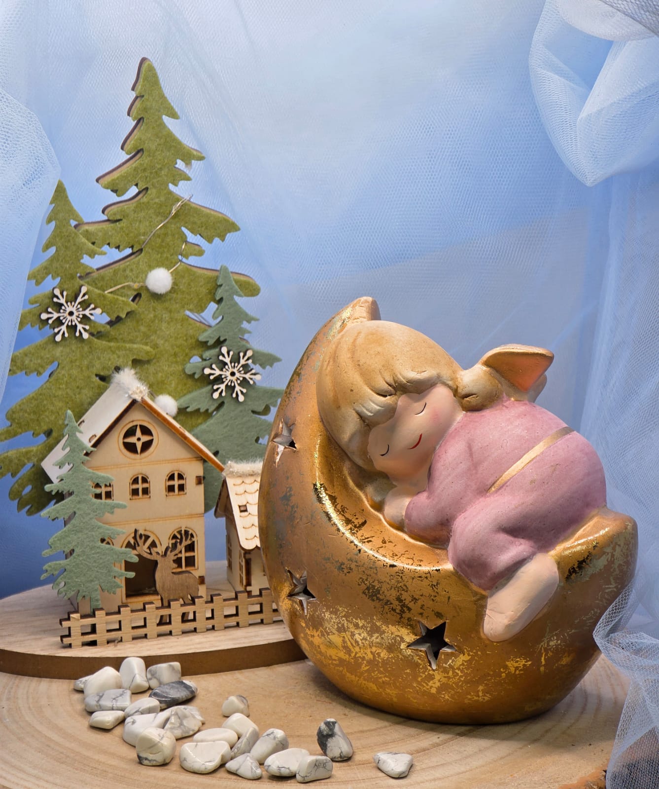 Addobbo angelo addormentato su luna in ceramica con luci